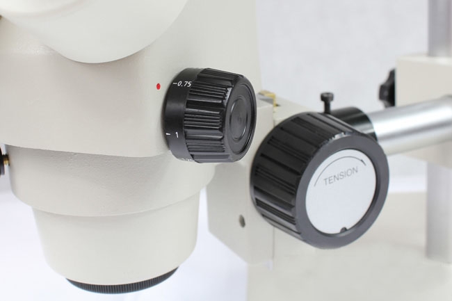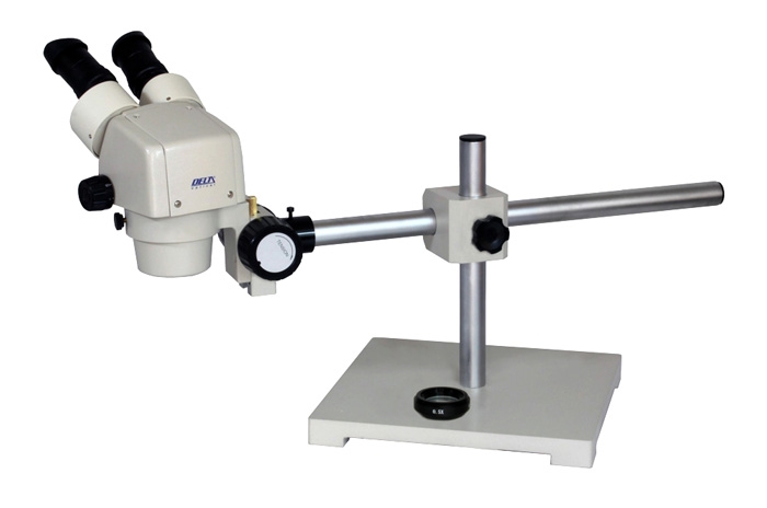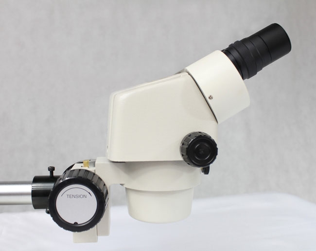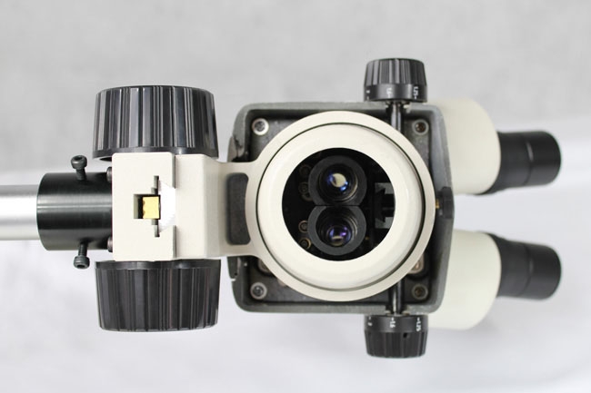 Бинокулярная насадка на подвижном кронштейне - можно регулировать расстояние до 540 мм от вертикальной оси кронштейна (кронштейн высотой 238 мм). Большое рабочее расстояние (от 77 мм до 111 мм) позволяет изучать крупные объекты. Каждый окуляр (10х) имеет диоптрийную регулировку. Поле зрения 6 мм - 46 мм. Основание кронштейна - чугунное.