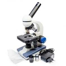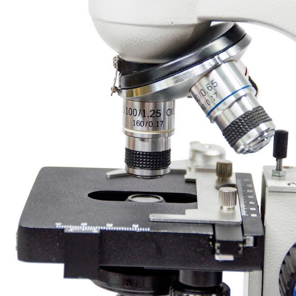 Комбинация двух широкопольных окуляров и четырех объективов, обеспечивают увеличения в диапазоне от 40 до 1600 крат. Все оптические элементы (объективы, окуляры и конденсор) выполнены из стекла. Широкопольные окуляры имеют просветляющее покрытие и обеспечивают контрастное и равномерно четкое изображение по большей части поля зрения. Ахроматические объективы стандарта DIN рассчитаны на работу с покровным стеклом толщиной 0.17 мм. Подпружиненная конструкция сорокакратного и стократного объективов убережет от повреждений препарат и сами объективы при их взаимном максимальном сближении. Не смотря на то, что конденсор данной модели микроскопа не позволяет получить максимальное разрешение при использовании иммерсионного объектива 100х, все же наличие данного объектива значительно расширит возможности для наблюдения, особенно при использовании иммерсионной жидкости.