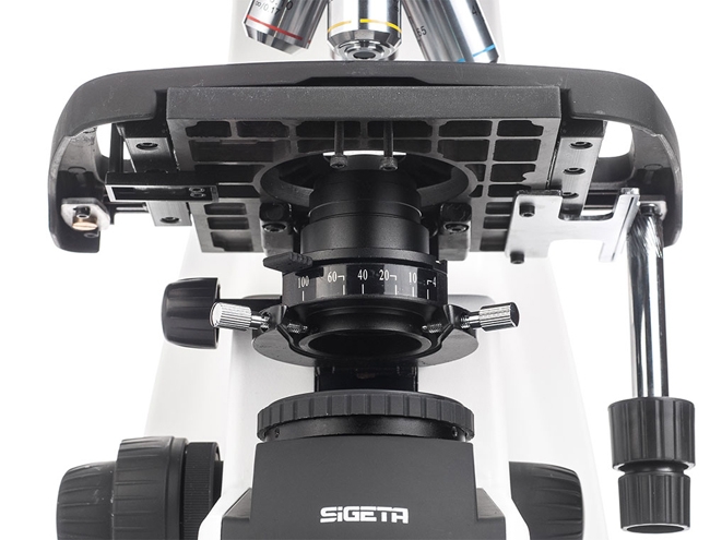 Система освещения биологического микроскопа SIGETA BIOGENIC 40x-2000x настроена по методу Келера. Конденсор большой числовой апертуры с ирисовой диафрагмой допускает возможность центрирования и изменения высоты. При необходимости верхняя линза снимается: это может потребоваться при работе с экстра-широкопольными окулярами на небольшом увеличении. На боковую поверхность конденсора нанесена шкала соответствия кратности объектива и степени открытия апертурной диафрагмы.