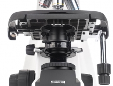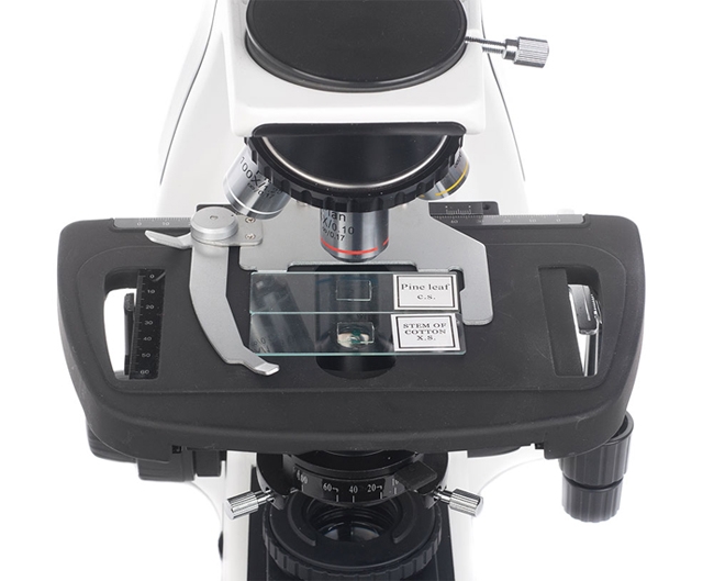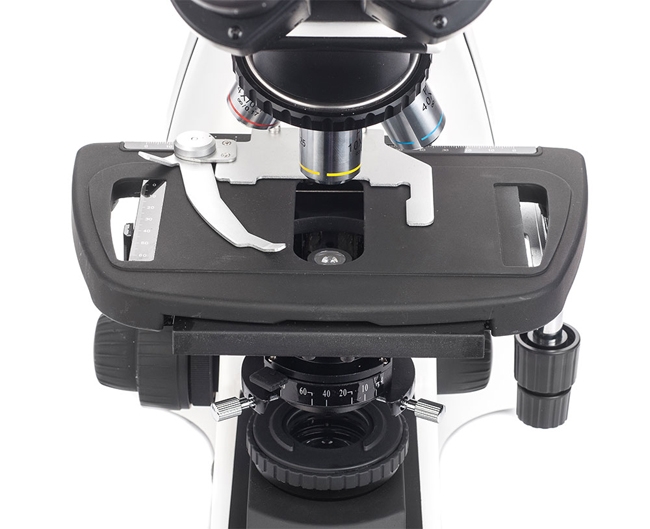 Оборудованный микрометрическими суппортами предметный столик имеет матовое графитовое покрытие, устойчивое к образованию царапин и пятен. Между зажимными лапками препаратоводителя можно разместить сразу 2 слайда и перемещать их параллельно, сравнивая исследуемые образцы на выбранном увеличении. При размерах столика 21.5 x 15 см диапазоны перемещения слайда вдоль горизонтальных осей составляют 0–7.5 см (по ширине) и 0–5.5 см (вглубь). Закрепленные на едином валу микрометрические винты имеют плавный ход, ими легко управлять не глядя.