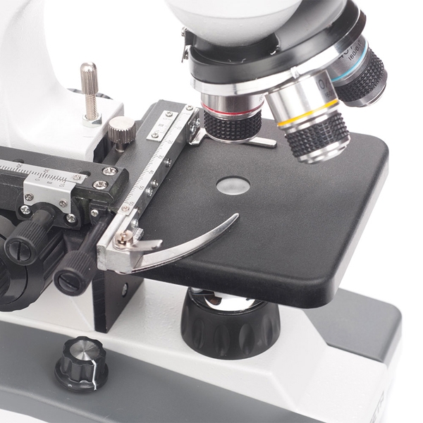 С каждой стороны корпуса микроскопа установлен коаксиальный фокусировочный узел. Настройка резкости изображения происходит путем поднятия-опускания платформы со слайдом. Рабочее расстояние зависит от мощности выбранного объектива: для 4-кратного оно равняется 3.3 см, для остальных – 0.6 см и 0.05 см (в порядке возрастания кратности). Во избежание раздавливания покровного стекла при фокусировке на большом увеличении предметный столик оснащен винтовым упором.