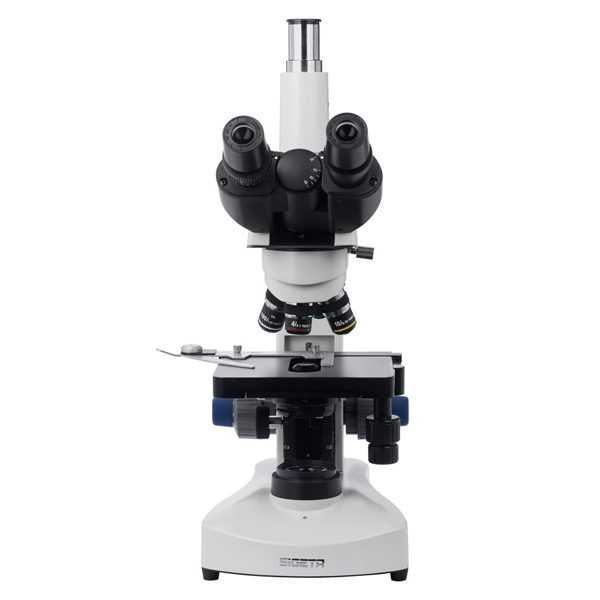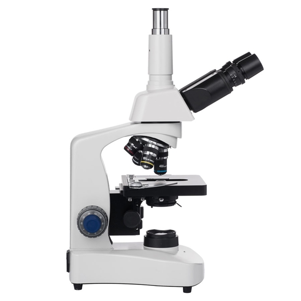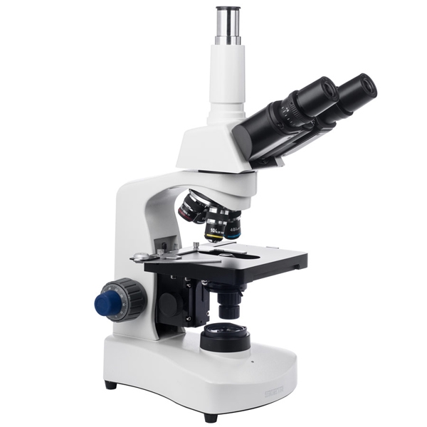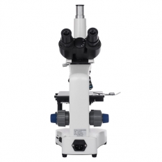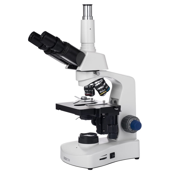 Тринокулярная голова микроскопа включает в себя наклонный бинокуляр (30°) с регулируемым межцентровым расстоянием (48-75 мм) и вертикально установленный фото-адаптер. Третий оптический порт предназначен для подсоединения цифровой камеры с посадочным диаметром 23.2 мм. Пара комплектных окуляров WF 10x/18 мм составлена по схеме Кельнера, исключающей влияние на результат хроматических аберраций. На основные оптические поверхности окуляров нанесено многослойное антибликовое покрытие, улучшающее трансмиссию света.