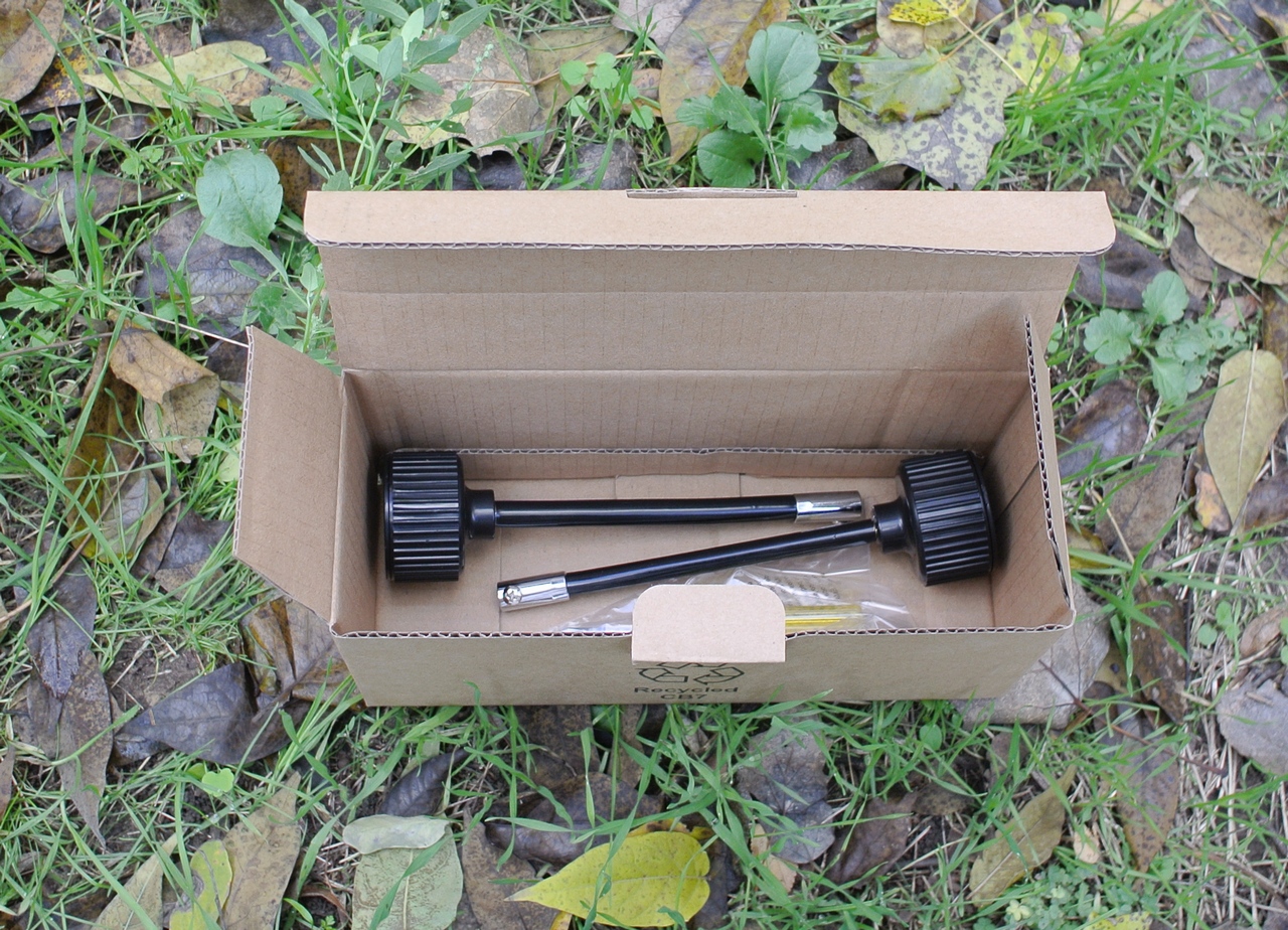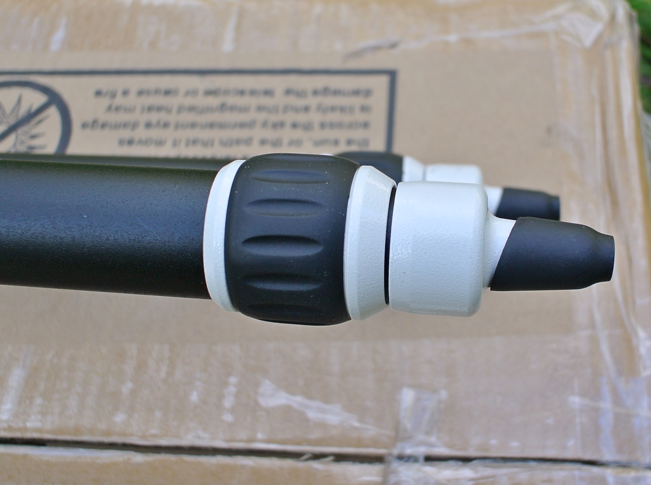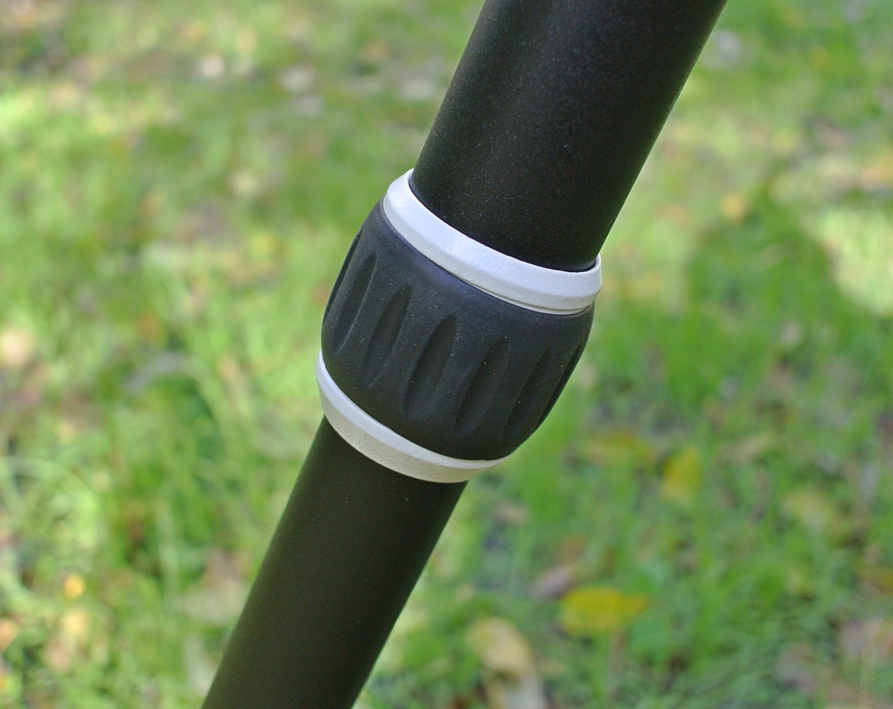 Секции соединяются алюминиевыми цилиндрическими муфтами белого цвета. Для удобства хвата снаружи на них надеты рифленые резиновые кольца. Опоры ног также белые алюминиевые, с конусообразными наконечниками. Для улучшения сцепляющих и амортизирующих свойств на них надеты резиновые колпачки.