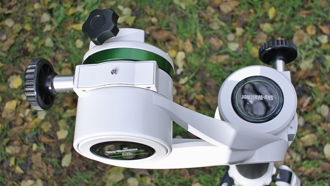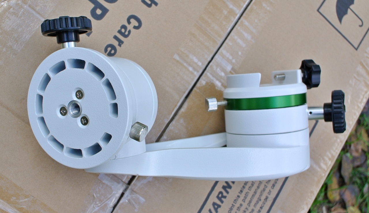 Наведение трубы по азимуту можно выполнять вручную или при помощи маховичка тонких движений (у него большая черная пластиковая головка) посредством червячной передачи. Он съемный и его при необходимости можно заменить входящей в комплект поставки ручкой с длинным поводком.