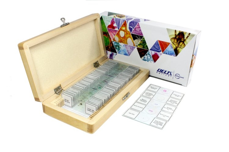 Большой набор микропрепаратов Delta Optical (50 шт.) для детального изучения под микроскопом в деревянном чемоданчике. Все препараты разные. Бактерии, грибы, одноклеточные, срезы растений и тканей животных, насекомые. Набор препаратов для изучения, включающий элементы растительного и животного происхождения.