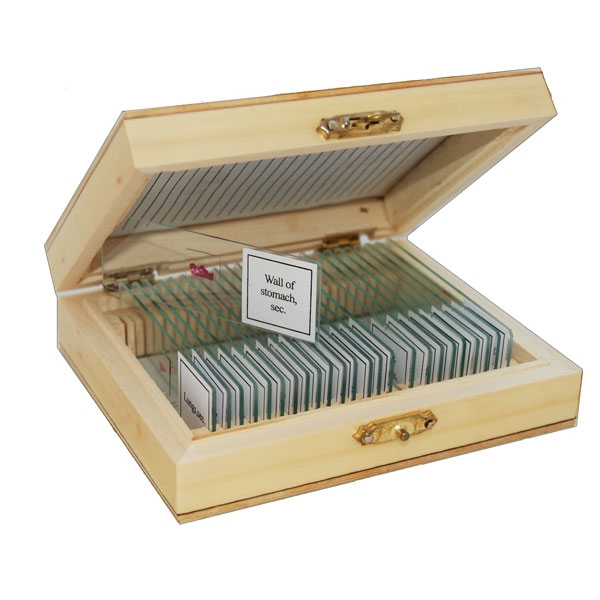 Набор из 25 готовых слайдов для биологических микроскопов. Упакован в деревянную коробочку.