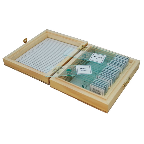 Набор из 25 готовых слайдов для биологических микроскопов. Упакован в деревянную коробочку.