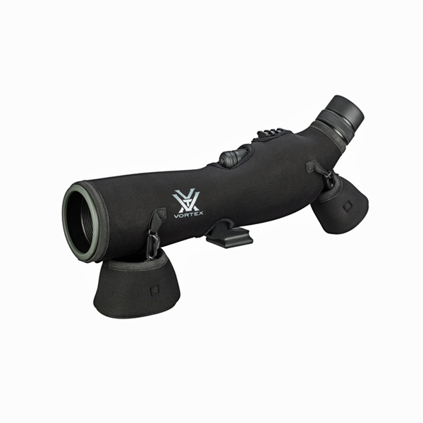 Из интересных решений - встроенная планка Picatinny, позволяющая разместить либо коллиматорный прицел для удобства предварительного наведения на цель, либо подствольный фонарь для наблюдений при недостаточной видимости. Двухскоростной фокусер имеет различный профиль накатки на маховике точной и грубой фокусировки, таким образом их можно отличить тактильно, не отвлекая глаз от наблюдения. Кольцо с гнездом крепления штатива проворачивается вокруг корпуса, надежно фиксируется и позволяет установить трубу под любым удобным для наблюдения углом. Полевой чехол выполнен из неопрена, части чехла, закрывающие окуляр и объектив, крепятся на карабинах и имеют дополнительную жесткость для предотвращения повреждения линз.
