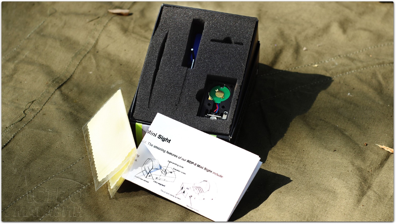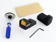 Delta Optical MiniDot поставляется в фирменной коробке, где уложен вместе с аксессуарами в поролоновой форме. В комплекте с прицелом краткая инструкция, отвёртка для калибровки, ключ под шестигранник, калибровочная шкала, салфетка и батарейка.