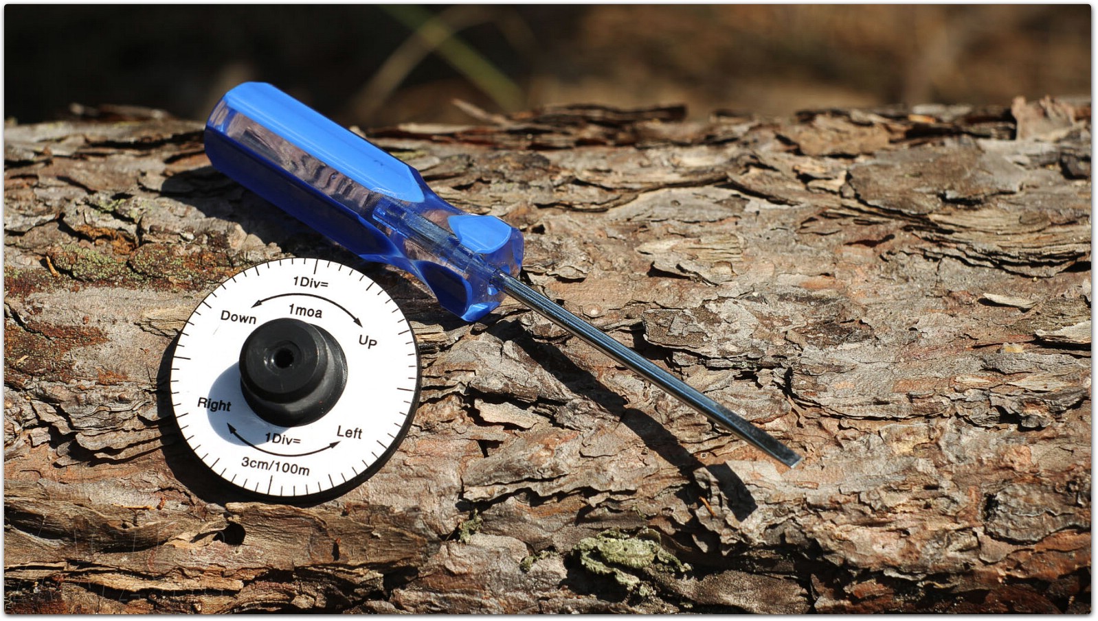 Шкала размечена делениями, каждое из которых составляет 3см с дистанции в 100м и соответствует одной единице по шкале MOA. Для внесения поправок нужно одеть диск со шкалой на отвёртку и вращать верхний винт под шлиц - для внесения поправок по высоте, и боковой винт справа - для поправок по азимуту.