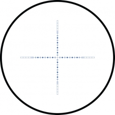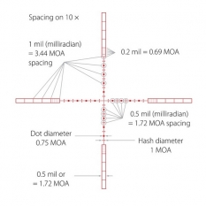 10х 1/2 Mil Dot IR - удобная универсальная сетка для максимально точного прицеливания на различных расстояниях. Главное отличие от обычной прицельной марки Mil Dot состоит в том, что тут имеются дополнительные пересечения, отмечающие пол мила. Все компоненты этой сетки имеют строго регламентированные размеры, расстояния между всеми элементами также регламентированы. Благодаря этому не проблема определить расстояние до цели либо размеры цели, приняв при этом правильную поправку на ветер и определить траекторию падения пули. Данный 1/2 Mil Dot верен при 10-кратном увеличении. Для других увеличений линейные и угловые размеры определяются методом интерполяции, либо по специальным таблицам. Персональную адаптацию сетки под конкретное оружие и тип снаряда позволит совершить бесплатный баллистический калькулятор X-ACT
