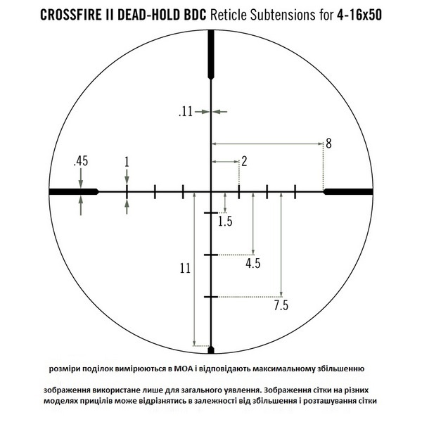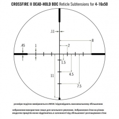 Располагая увеличенным фокусным расстоянием выходного зрачка, механизмом быстрой фокусировки Fast Focus, механизмом отстройки параллакса на объективе, полным многослойным просветлением оптики и обнуляемыми барабанами ввода поправок, данный прицел сконструирован без компромиссов и по своим характеристикам оставляет далеко позади большинство аналогичных моделей в своей ценовой категории. Прочный монолитный корпус из авиационного алюминия с анодированным покрытием защищен от царапин, влаги, пыли и запотевания. Универсальная прицельная сетка Dead-Hold BDC позволяет быстро определить траекторию падения пули на различных дистанциях и принять необходимые поправки по вертикали и горизонтали. Дополнительно комплектация расширена солнцезащитной блендой. Прицел Vortex Crossfire II 6-24x50 AO (BDC) рекомендован для охоты и спортивной стрельбы на средние и дальние дистанции из мощного пневматического, а также нарезного оружия под патроны центрального боя и кольцевого воспламенения калибром до .308 WIN включительно.