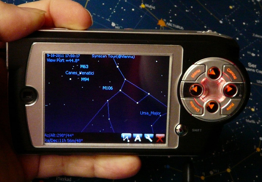 Поиск небесных объектов может стать большой проблемой для начинающих астрономов. Использование звездных карт, атласов и ноутбуков в темноте не всегда удобно, не говоря о вероятности что-то уронить или потерять! Все это может заменить удобное и полезное устройство SynScan Tour, которое помещается на ладони. SynScan Тour прост в эксплуатации, имеет как сенсорный экран, так кнопочное управление. SynScan Tour несет в себе все необходимые данные и знания, которые помогут вам в изучении глубин космоса.
