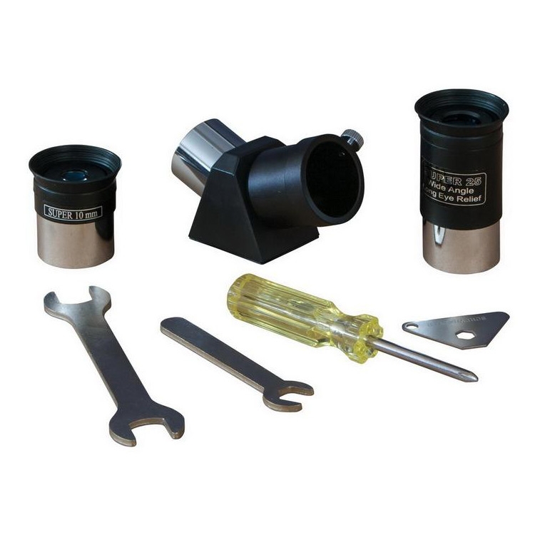 Прибор комплектуется двумя окулярами – Super 25 мм и Super 10 мм. Из-за небольшого фокусного расстояния объектива (40 см) телескоп в базовой комплектации не даст боль­шого увеличения, но для обзорных наблюдений и изучения поверхности Луны кратностей 16х/40х вполне достаточно. Металлический реечный фокусер телескопа имеет стандартный внутренний диаметр – дюйм с четвертью, поэтому при необходимости можно докупить короткофокусный окуляр, способный обеспечить бо́льшую кратность.