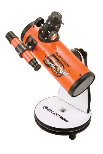 Инструмент имеет настольный дизайн и компактные размеры при небольшом весе, что позволит с легкостью переносить и хранить его. Стильная декоративная отделка в классических оранжевых тонах делает данный телескоп прекрасным подарком или сувениром для тех, кто интересуется астрономией. На внешней стороне трубы телескопа напечатана оффициальная емблема 50-летнего юбилея марки Celestron.