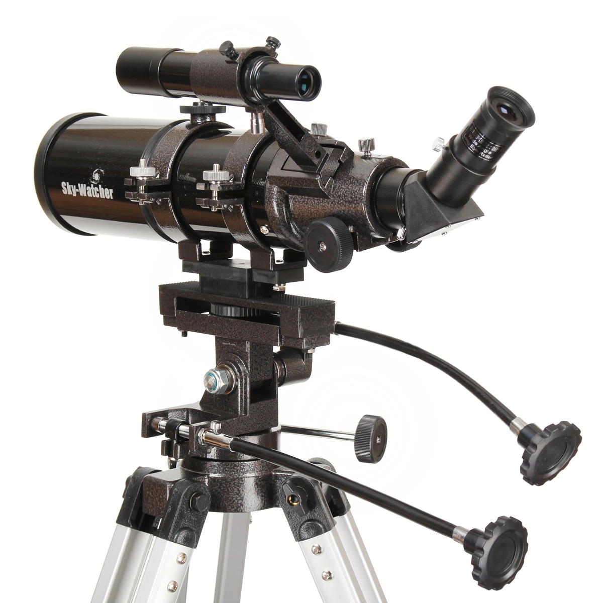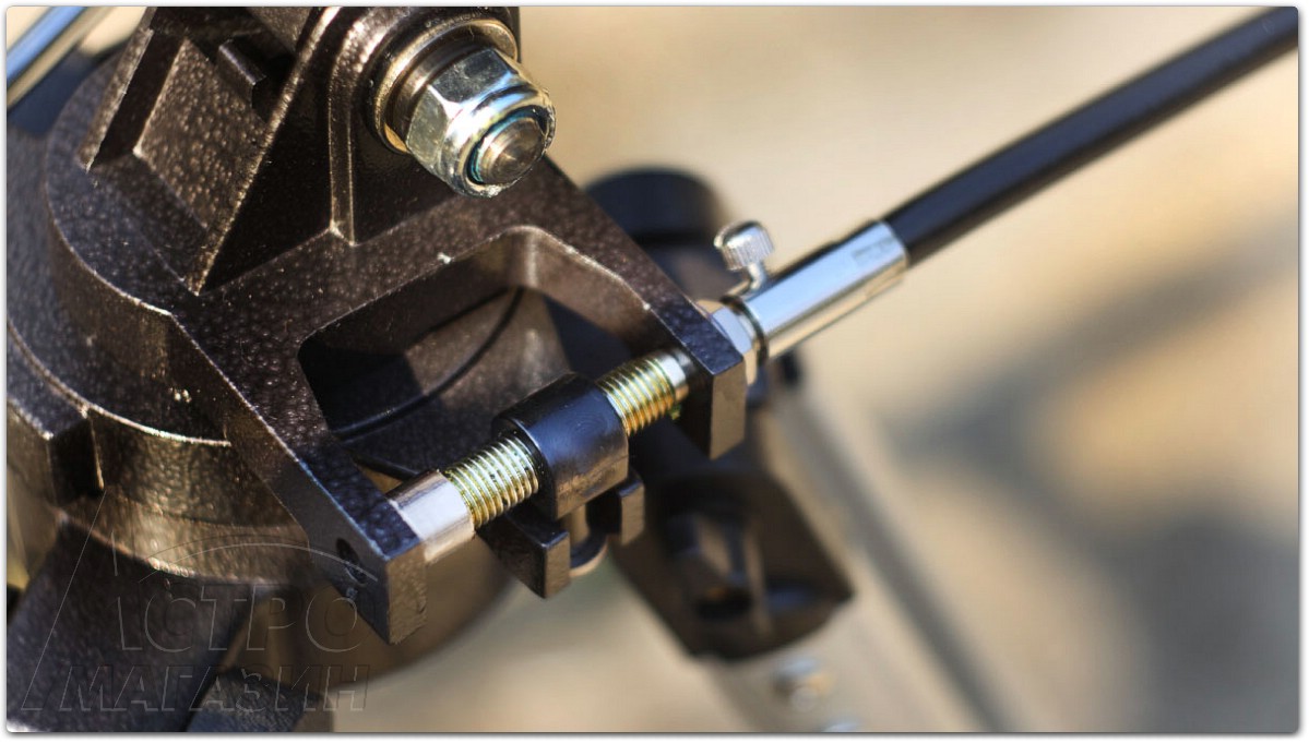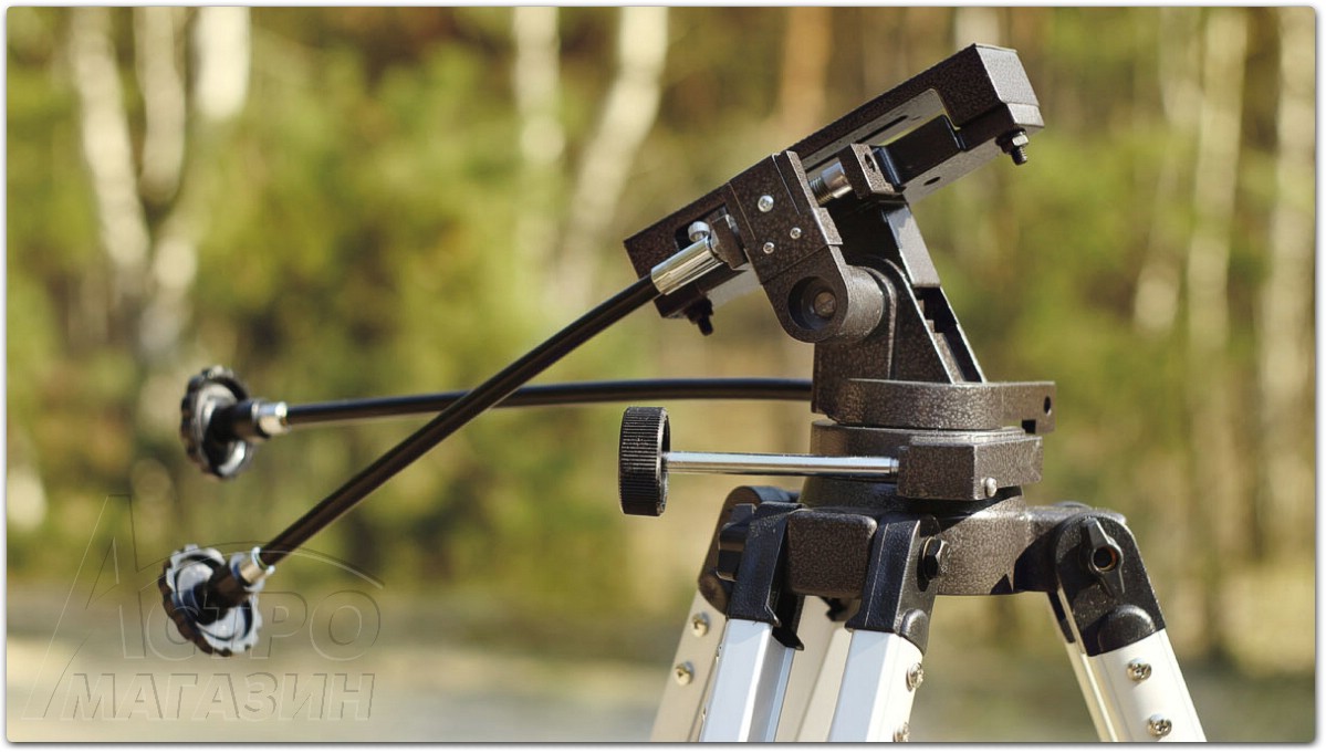 Монтировка вращается по вертикальной и горизонтальной осям, которые оснащены ручками тонких движений. Здесь применён винтовой механизм с поводком, то есть ручка тонких движений вращается до тех пор, пока хватает хода винта, после чего механизм нужно перевести в исходную позицию.