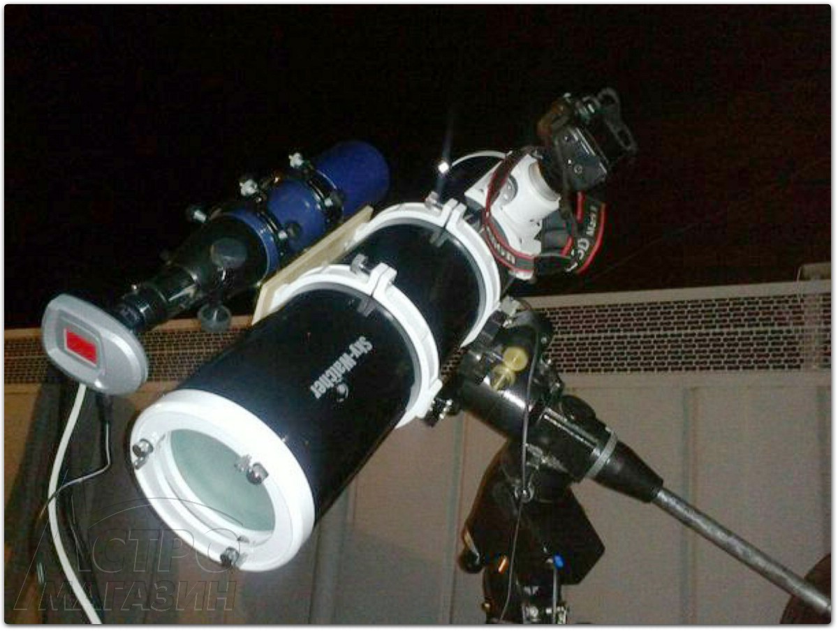 На резьбу фокусёра через трубку-экстендер можно установить небольшую гидирующую камеру, типа QHY-5 или её аналога. Сам же телескоп имеет достаточно прочную конструкцию и в комплектных кольцах-хомутах может быть легко смонтирован на серьёзном астрографе.