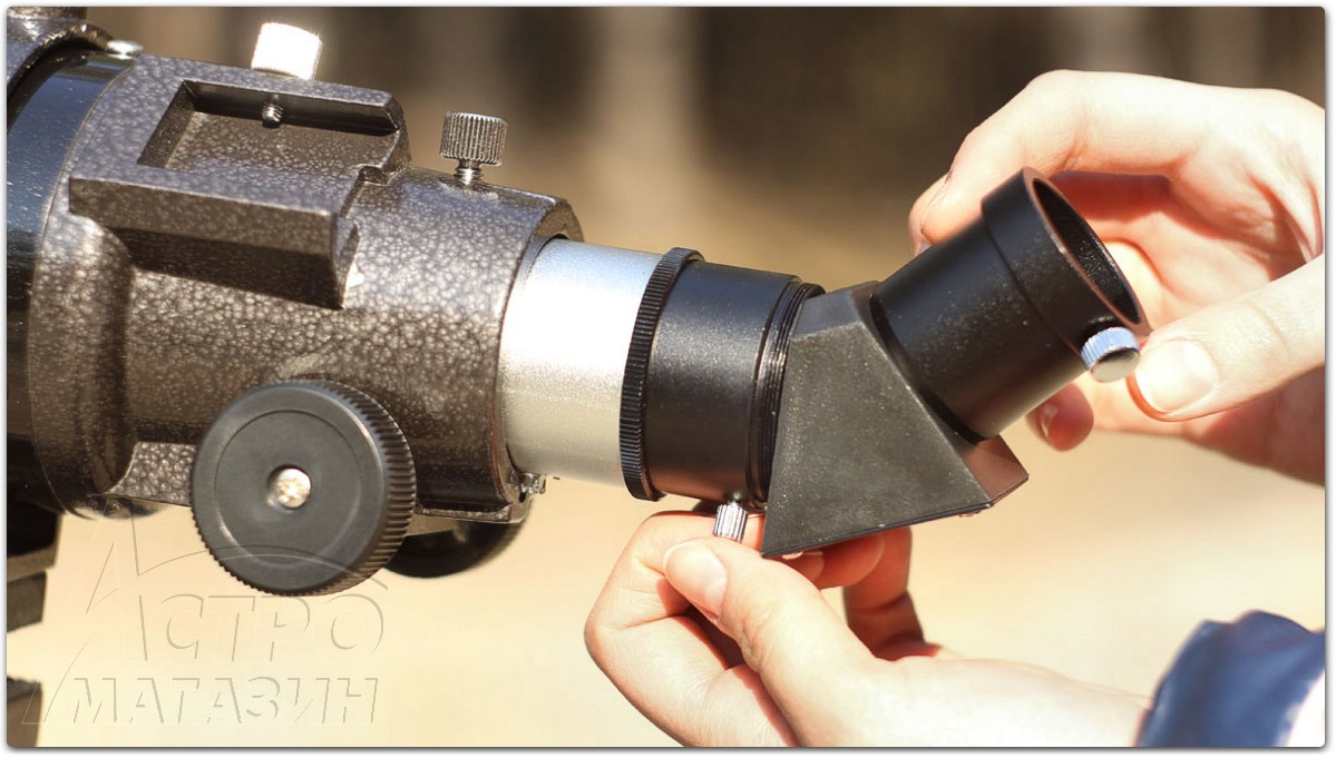 Но в нашей комплектации телескоп предназначен скорее для наземных и обзорных астрономических наблюдений. Для этого поставляется удобная 45-ти градусная призма, дающая полностью прямую "земную" картинку и пара простых окуляров с фокусом 25 и 10мм. Окуляры обеспечат небольшие увеличения в 16х и 40х, соответственно.