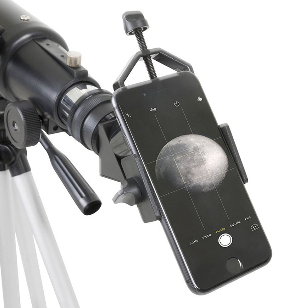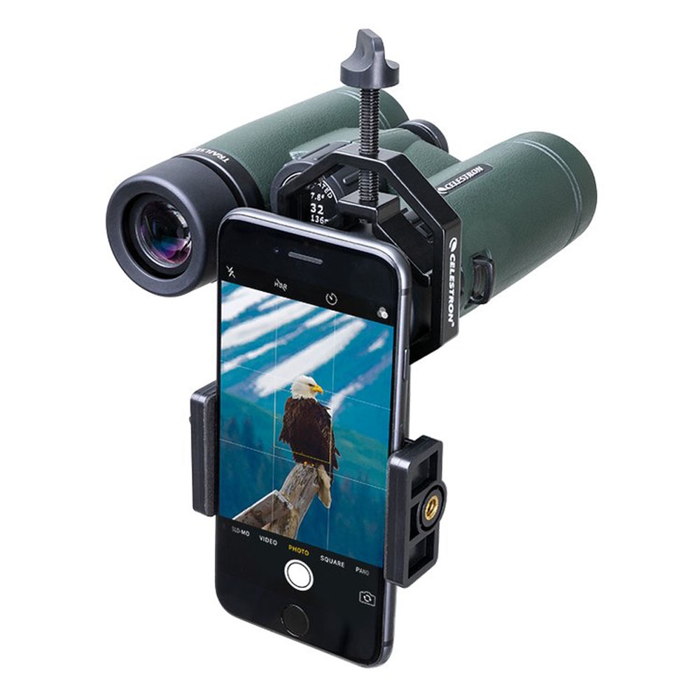 С помощью этого удобного и простого в использовании адаптера для смартфона Вы можете делать снимки своих наблюдений практически с любого оптического прибора. Независимо от того, снимаете ли Вы Луну для Instagram через телескоп или зрительную трубу, или делитесь своими последними наблюдениями за дикой природой с помощью бинокля или зрительной трубы, или сохраняете лабораторные наблюдения с помощью своего микроскопа, этот универсальный адаптер легко справится со всем этим. Независимо от того, какой оптический прибор Вы выберете, установка и использование адаптера не вызовет у Вас трудностей. Сначала поместите свой смартфон в адаптер. Он надежно удерживается на месте с помощью зажимных винтов, которые фиксируют Ваш телефон на месте. Затем выровняйте камеру телефона по центру окуляра. После того, как вы добились идеального положения, зафиксируйте адаптер на окуляре оптического прибора.