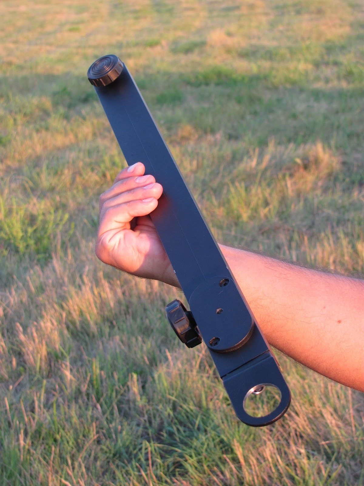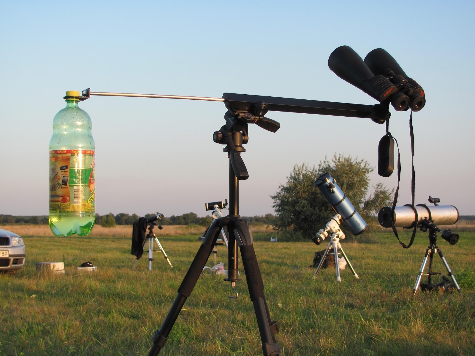 Монтировка Parabino Travel представляет собой раздвижную перекладину, которая устанавливается на головку стандартного фотоштатива. По одну сторону монтировки вы можете закрепить бинокль весом до 2кг на L-адаптере. Выдвижная штанга имеет на своём конце крепление под горлышко стандартной пластиковой бутылки с водой, которая оказывается на другой стороне монтировки, играя роль противовеса.
