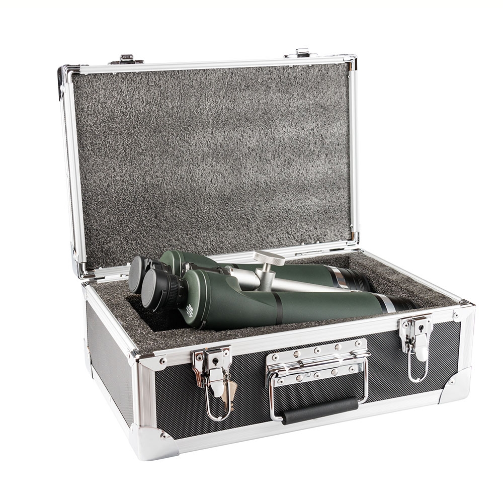 Комплектация бинокля включает в себя все необходимое для поддержания максимальной защиты как в полевых условиях, так и в пути: помимо защитных крышек, нашейного ремня и салфетки для очистки оптики, в комплект входит жесткий кейс с мягкой формой внутри, который закрывается на ключ.