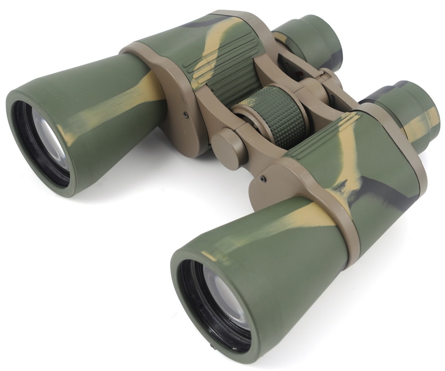 Бинокль Arsenal 10x50 камуфляж - оригинальный бинокль для наблюдения за природой, для туризма и активного отдыха. Цвет резинового покрытия корпуса - камуфляж. Важной особенностью данной модели является сверхширокое поле зрения, что обеспечивает комфортные условия наблюдения за протяженными и быстродвижущимися объектами, в частности за летящими птицами, бегущими животными и т.п. Большой диаметр выходного зрачка обеспечивает достаточно высокое значение относительной светосилы, что, в свою очередь, гарантирует формирование ясного и светлого изображения не только в дневное время суток, но и в сумерках. Классическая оптическая схема с использованием призм типа Porro, изготовленных из боросиликатного сорта оптического стекла (BK7). Чтобы уменьшить количество отраженного света, и тем самым повысить качество картинки, на линзы бинокля нанесено специальное просветляющее покрытие синего цвета.