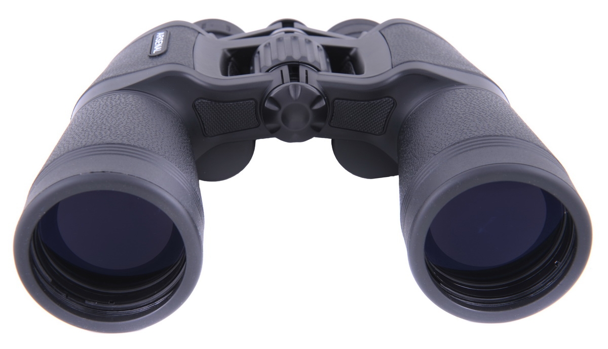 Окулярная крышка также снабжена петлями и может быть легко закреплена на шейном ремешке.Корпус бинокля имеет традиционные обводы, без ломаных линий. Он практически полностью выполнен из прочного поликарбоната. Исключение составляют лишь элементы центральной балки бинокля, призменных блоков и фокусировочного механизма. Цвет бинокля темно-серый, практически черный. Тубусы и призменные блоки бинокля покрыты декоративными резиновыми накладками аналогичного оттенка. Резиновое покрытие бинокля весьма приятно на ощупь и имеет текстурную поверхность, имитирующую кожу. Среди деталей корпуса бинокля стоит отметить проушины для фиксации шейного ремешка и металлическое гнездо крепления штативного L-адаптера, закрытое удобной декоративной завинчивающейся крышечкой. У бинокля имеется качественно выполненная шкала межзрачковых расстояний. Диапазон регулировки данного расстояния (IPD) вполне классический и изменяется в пределах от 58 до 72мм. Бинокль выполнен по классической оптической схеме Porro с применением призм типа ВК7. Его объективы покрыты голубовато-лиловым двухслойным просветляющим покрытием типа MC (multi-coated) на основе фторида магния (MgF). Окуляры бинокля (типа Эрфле) имеют вынос зрачка порядка 12 мм. Диаметр глазных линз окуляров 18 мм, а диаметр выходного зрачка примерно 3 мм. Наглазники на окулярах бинокля выполнены из мягкой резины и имеют высоту 5 мм. Призмы прибора просветлены аналогичным образом и частично оснащены светозащитными крышками. Фокусировка бинокля - центральная. Колёсико фокусировки широкое, пластиковое диаметром 34 мм, с резиновым покрытием и радиальной накаткой. Расположение узла удобное, ход плавный. Диапазон настройки укладывается в полтора оборота колёсика. Это гарантирует, что процесс наведения на резкость будет весьма информативен и точен. Минимальная дистанция фокусировки бинокля составляет 6 метров.