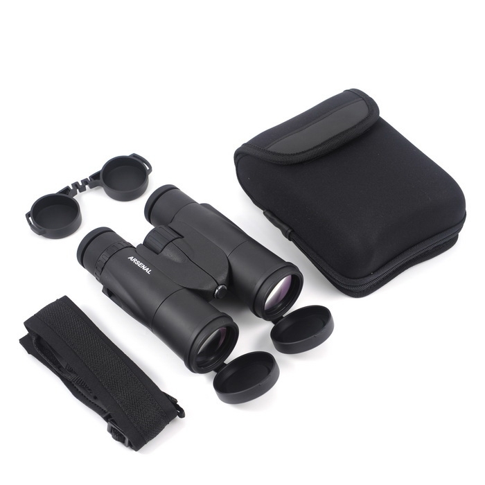 Бинокль Arsenal  8x42 DCF - качественный компактный водонепроницаемый бинокль для наблюдения за природой, для туризма и активного отдыха. Бинокль имеет японскую сборку и индивидуальный серийный номер. Данная модель отлично подойдет для наблюдений как днем, так и в сумерках. Стильный и эргономичный дизайн. Ударопрочный поликарбонатный корпус азотозаполнен и герметично уплотнен, что исключает образование конденсата на внутренних поверхностях линз, а также проникновение влаги внутрь корпуса. Таким образом, бинокль допускает использование при любых погодных условиях. Возможно длительное нахождение бинокля под дождём, снегом или в условиях повышенной влажности. Для защиты от механический повреждений прочный корпус армирован нескользящим резиновым покрытием черного цвета.
