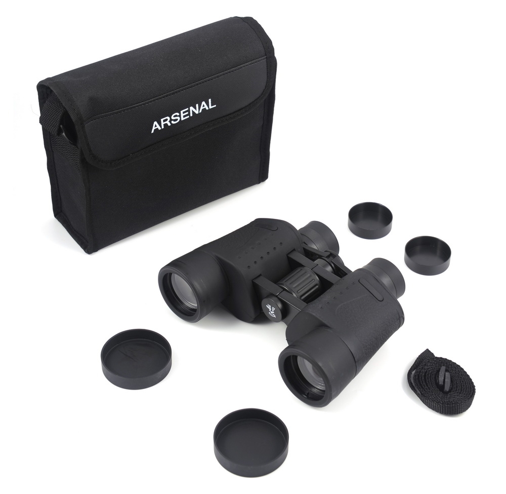 Бинокль Arsenal 8x40 Porro/Black NB07-0840 - оригинальный бинокль для наблюдения за природой, для туризма и активного отдыха. Важной особенностью данной модели является сверхширокое поле зрения, что обеспечивает комфортные условия наблюдения за протяженными и быстродвижущимися объектами, в частности за летящими птицами, бегущими животными и т.п. Большой диаметр выходного зрачка обеспечивает достаточно высокое значение относительной светосилы, что, в свою очередь, гарантирует формирование ясного и светлого изображения не только в дневное время суток, но и в сумерках. Классическая оптическая схема с использованием призм типа Porro, изготовленных из боросиликатного сорта оптического стекла (BK7). Чтобы уменьшить количество отраженного света, и тем самым повысить качество картинки, на линзы бинокля нанесено специальное просветляющее покрытие синего цвета.