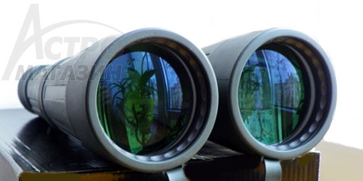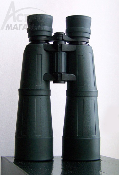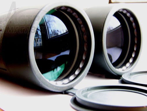 Знакомая нам фирменная надпись находится несколько необычно – на заглушке-шайбе штативного гнезда. Бинокль легко держится даже в небольших руках, его рифленые обрезиненные поверхности создают надежный захват наблюдателем. Вращение фокусировочного «барабана» требует заметных усилий, как и подстройка правого глаза. Вращение самих трубок адекватно прилагаемым усилиям. Резиновое покрытие имеет специфический запах, интенсивность которого быстро уменьшается.
