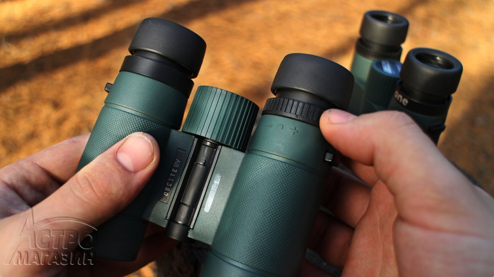 Под правым окуляром традиционно находится колёсико диоптрийной коррекции. Оно вращается туговато и с небольшими щелчками. Возможность крепления на штатив отсутствует и это правильно, наблюдать с рук очень комфортно.