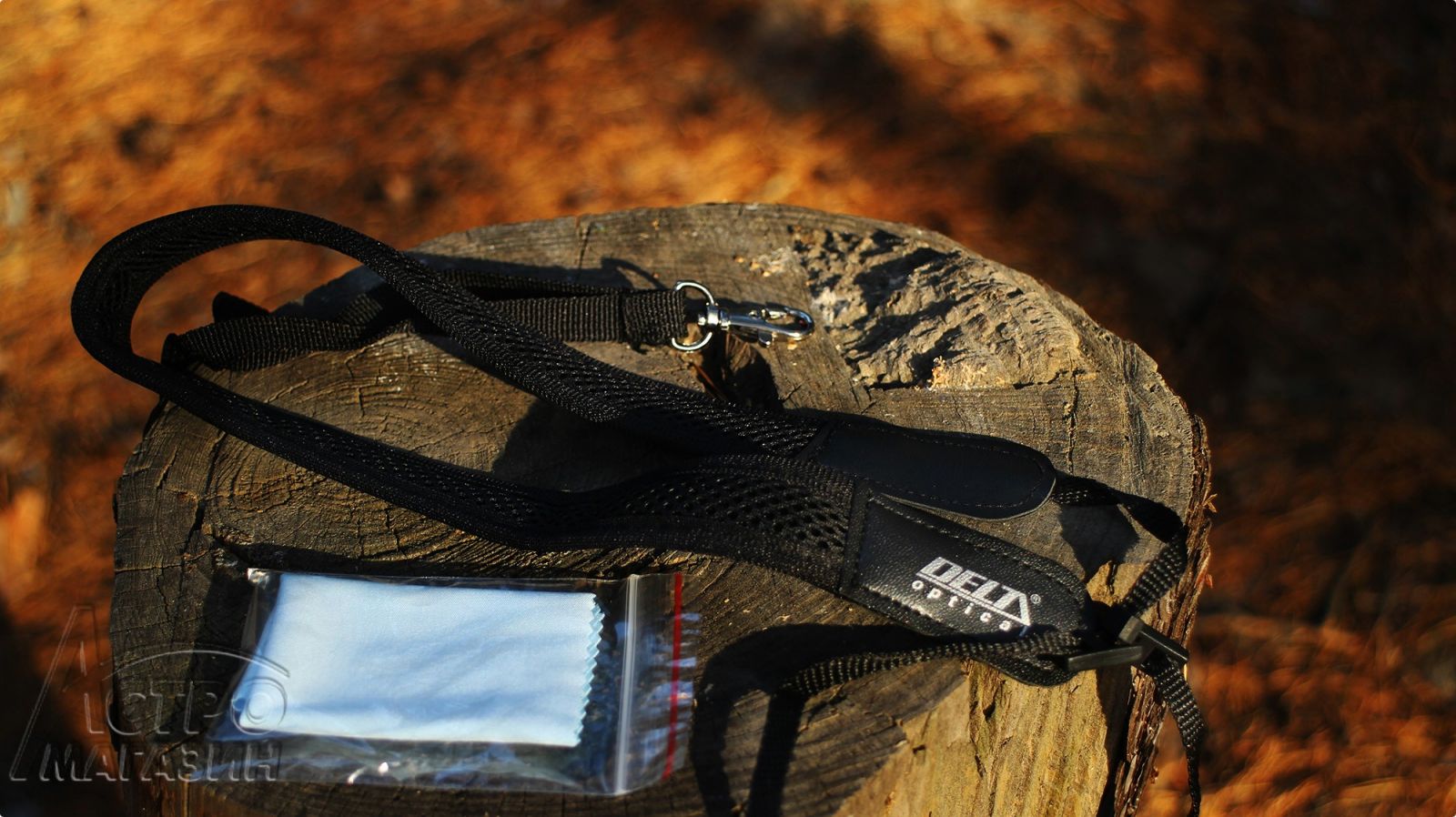 В комплекте также есть ремешок на чехол, качественная салфетка для оптики и добротный мягкий нашейный ремень, которым действительно удобно пользоваться.