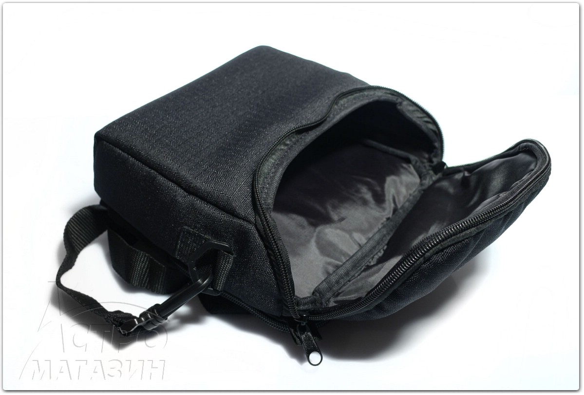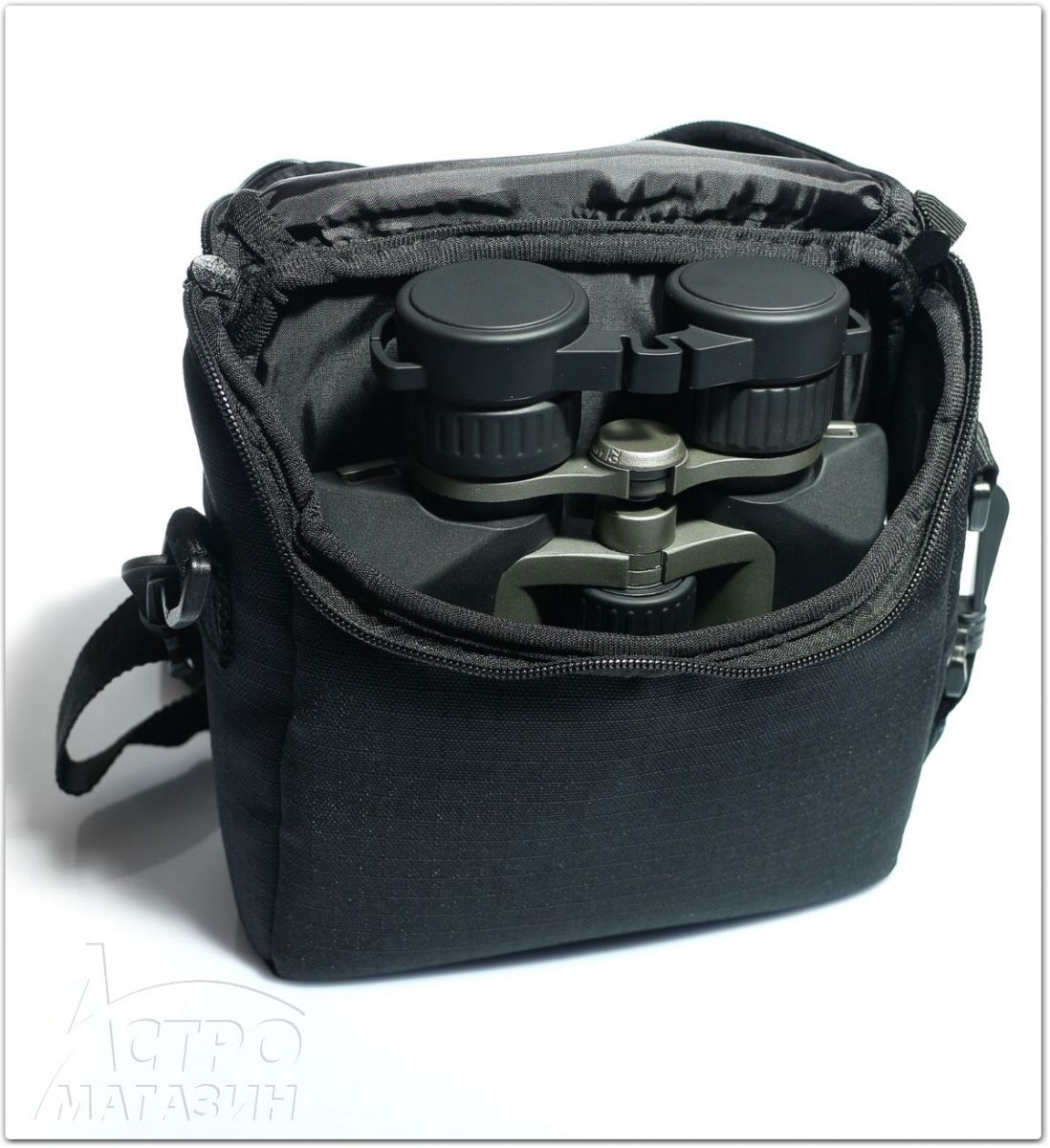 Чехол выполнен из синтетического материала. Мягкая прокладка защитит бинокль от незначительных ударов, но не более того. Впрочем я не могу вспомнить ни одной модели в этом ценовом сегменте, которая была бы укомплектована жёстким кофром. Чехол оснащён наплечным ремнём, который пристёгивается парой пластиковых карабинов, а также проушинами для ношения на поясе.