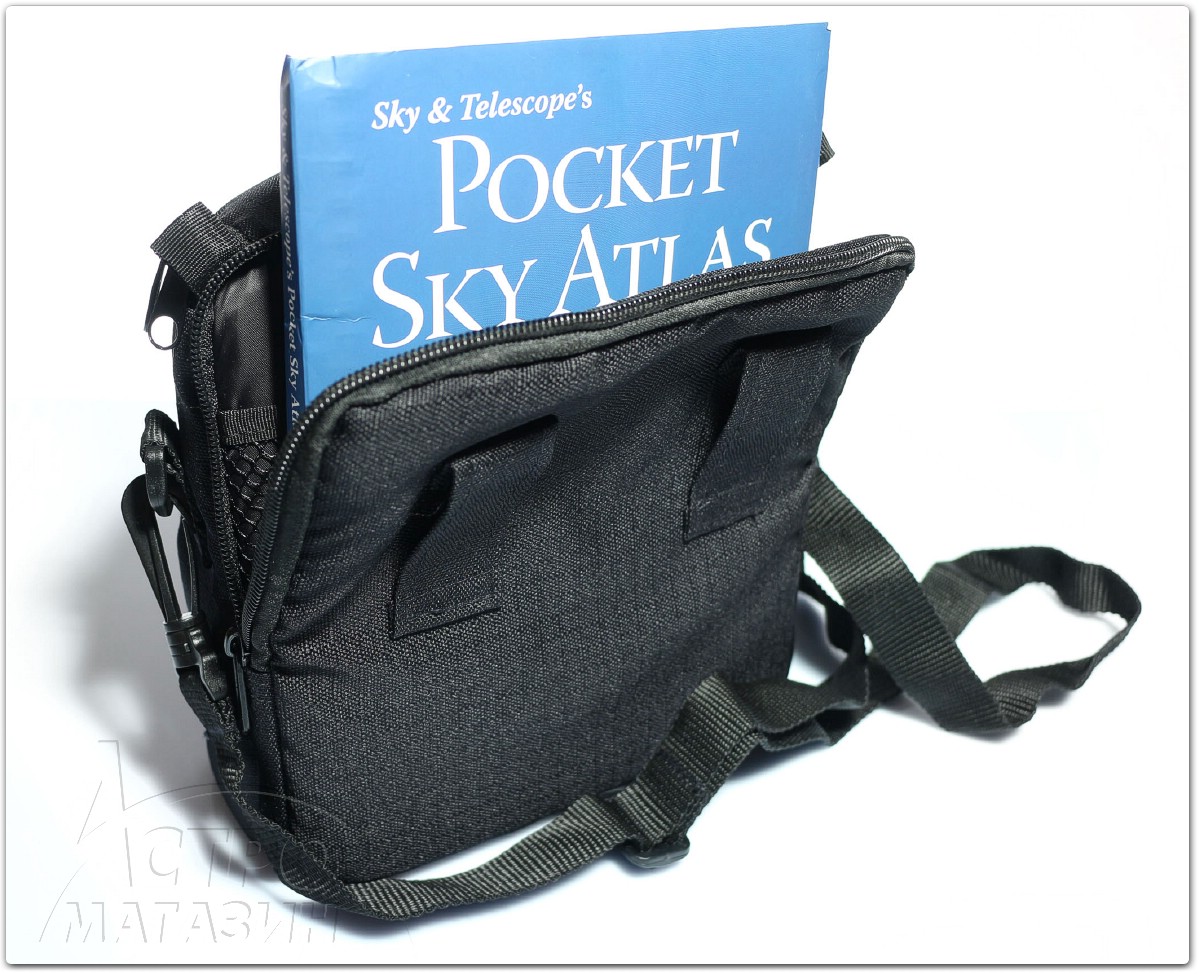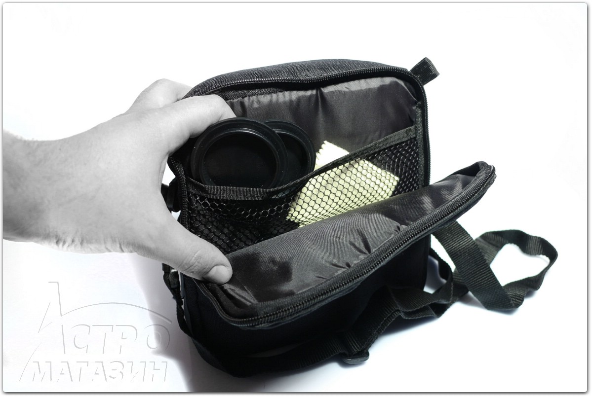 Бинокль в чехле закрывается клапаном на молнии, а с тыльной стороны имеется большой карман для аксессуаров. Мелочь, но многие смогут её оценить. Любитель астрономии сюда сможет положить небольшой атлас звёздного неба, а путешественник, например, карту местности. Внутри под сеткой ещё один карманчик, в котором удобно хранить крышки объективов во время наблюдений, салфетку и прочее.