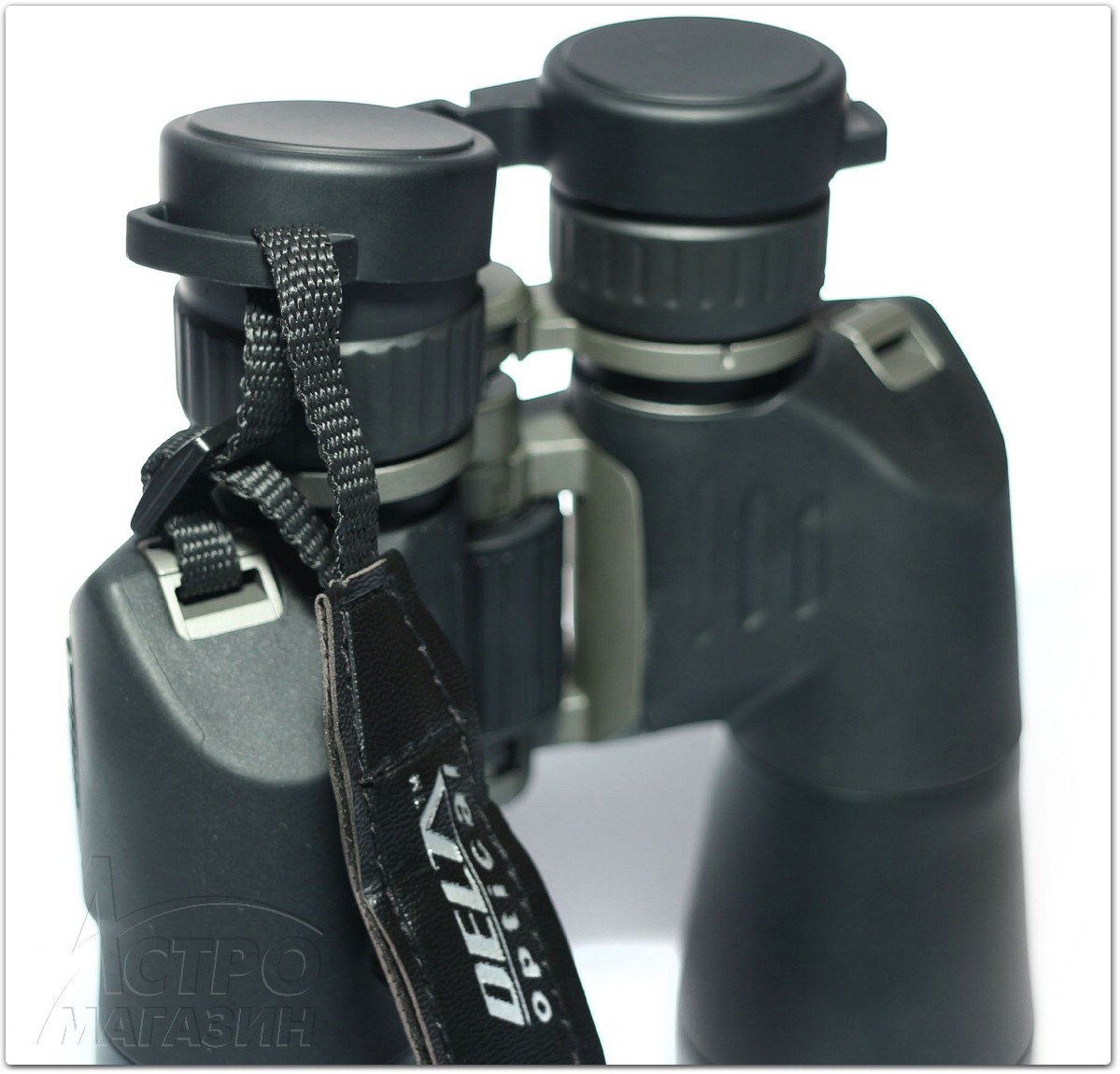 Сдвоенная окулярная крышка выполнена из мягкой резины. Она имеет проушину под ремень, так что потерять её не получится. Крышки объективов садятся достаточно плотно, но когда носите бинокль на шее, их лучше снимать и хранить в чехле.