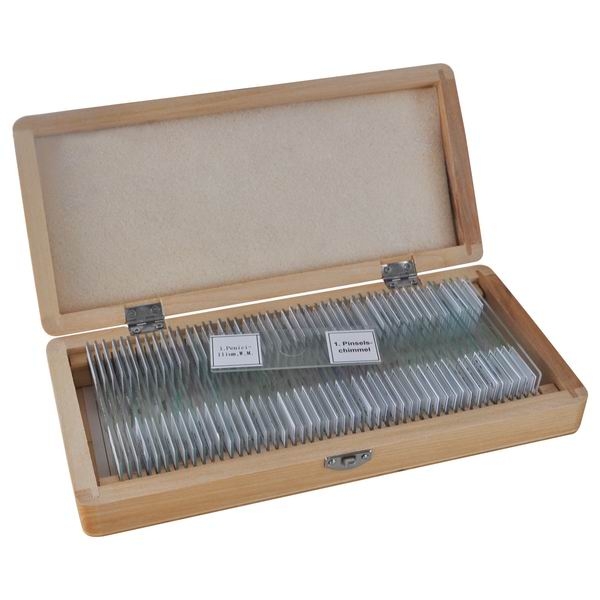 Набор специально подготовленных образцов (слайдов) для исследования под микроскопом. Большинство образцов обработаны специальными веществами для повышения контраста. Набор включает как образцы раститений и микроорганизмов, так и фрагменты тканей насекомых, рыб, животных и человека.