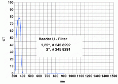 Примечание: Фильтр Baader Planetarium U (350 нм), 2" применим только для фотосъёмки с вебкамерами, CCD-камерами и цифровыми фотоапаратами - визуальные наблюдения с ним невозможны, из-за нечувствительности зрения к ультрафиолету. Для наилучших результатов рекомендуется использовать чувствительную CCD-камеру для, как минимум 5" телескопа, или вебкамеру для 8" телескопа.