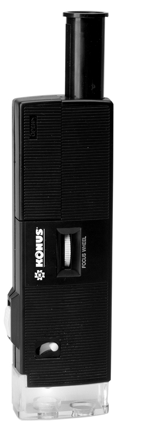 Карманный микроскоп чрезвычайно легкий и портативный. Konus POCKET 50x-80x имеет встроенную подсветку. Увеличение регулируется выдвижением окуляра, кольцо фокусировки на корпусе.