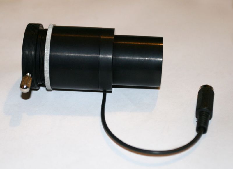 Корпус коллиматора выполнен под посадку в фокусёр 1,25''. Питание производится от блока питания 12В. Благодаря переотражениям от оптических поверхностей он позволяет достаточно точно отъюстировать практически любой телескоп или объектив.
