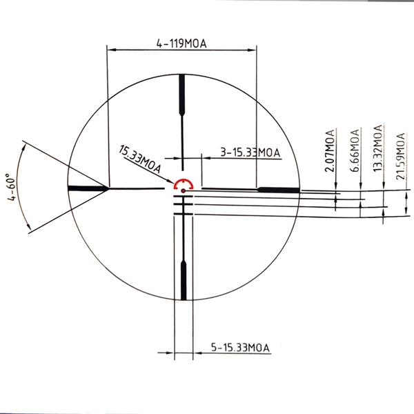 трех баллистических меток на удалении 6.66 МОА, 13.32 МОА и 21.59 МОА от горизонтали (без подсветки);