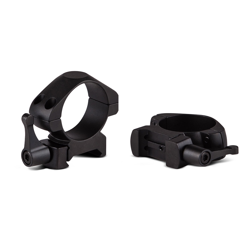 Низкие крепежные кольца Ø 30 мм средней посадки с системой быстрого монтажа/демонтажа Quick Release. Быстросъемная система позволяет в тактических условиях буквально за пару секунд удалить с оружия прицел – к примеру, из-за неожиданного выхода его из строя или изменения условий стрельбы.