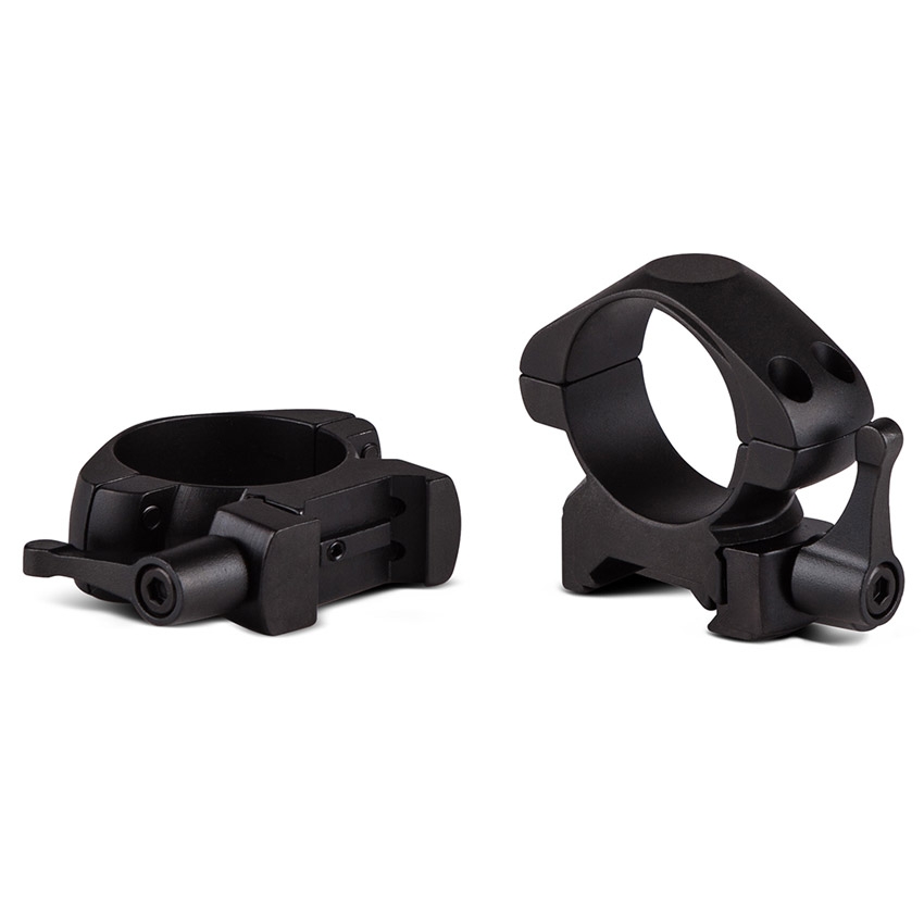 Монтажные кольца Ø 30 мм средней посадки с рычажным механизмом Quick Release. В экстремальной ситуации быстросъемная система позволит за пару движений снять прицел с оружия. Кольца устанавливаются на реечную планку Вивера (Пикатинни), выдерживают отдачу даже от серийной стрельбы.