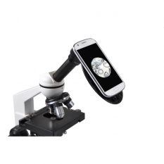 Кроме того, в комплектацию входит адаптер для камеры смартфона (планшета). Адаптер крепится на тубусе микроскопа и позволяет проводить фото и видеосъемку основной либо фронтальной камерой гаджета. Гладкая тыльная сторона смартфона надежно крепится с помощью множества присосок адаптера (в случае рифленой тыльной поверхности смартфона рекомендуется использовать фронтальную камеру).