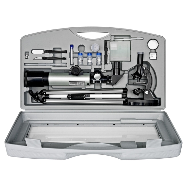 Помимо телескопа и микроскопа, набор включает в себя множество дополнительных аксессуаров. Все предметы набора хранятся в удобном кейсе, что позволяет доставить набор к новому месту наблюдения.