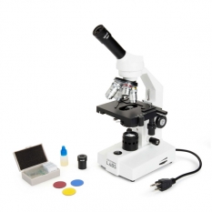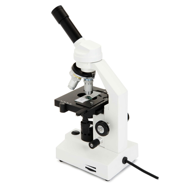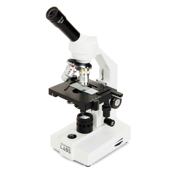 Данный лабораторный микроскоп американской компании Celestron имеет 2000 кратное увеличение, 2 окуляра (10x и 20x), а также четыре полностью ахроматические объективные стеклянные линзы (4x, 10x, 40x, 100x). Цельнометаллическая конструкция прибора полностью механически регулируется. Имеются микровинт для точного регулирования и макровинт для более грубой фокусировки. Для облегчения изучения исследуемых объектов снизу встроена галогенная подсветка. В комплект входит универсальный адаптер тока.