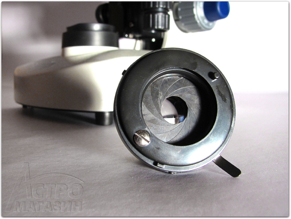 Под предметным столом на собственном суппорте с кремальерой закреплён линзовый конденсор с регулируемой диафрагмой. В нём есть крепление для установки цветных фильтров.