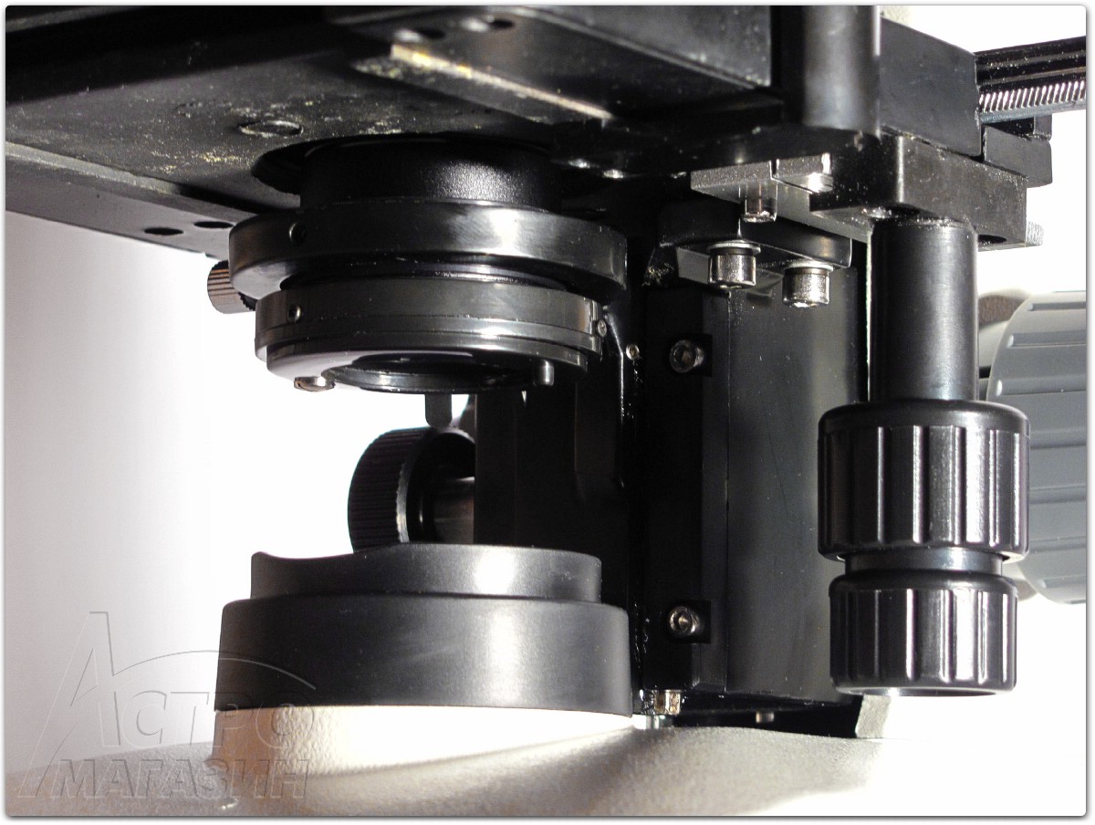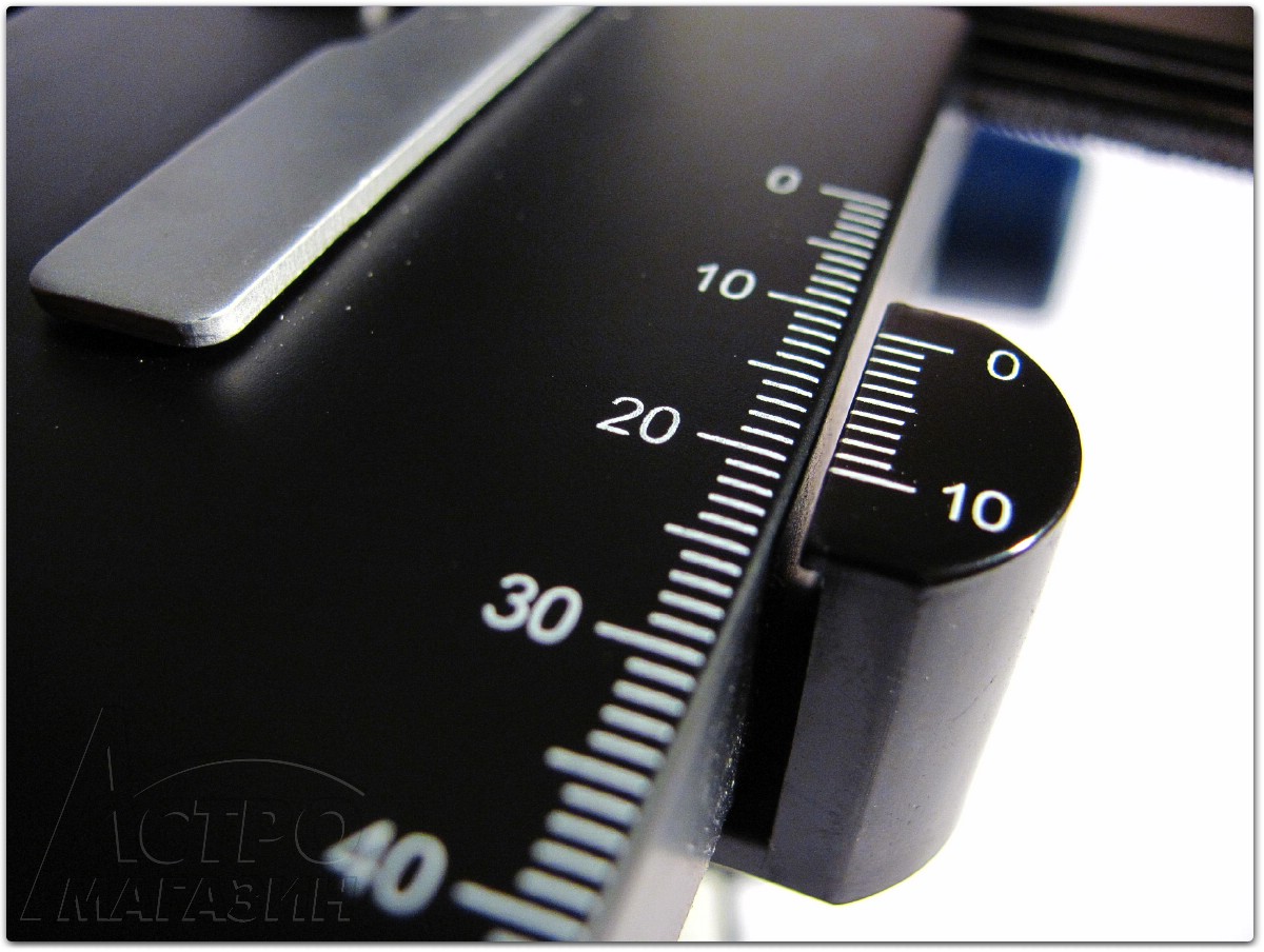 Отдельного внимания заслуживает привод перемещения всего стола, который отвечает за фокусировку изображения. По обе стороны станины находятся ручки, крупная – для грубой настройки, а внутри маленькая – для тонкого наведения резкости. Маленькая ручка даже имеет шкалу, размеченную на 360 градусов. Мелочь, но может помочь при «слепом» наведении резкости во время фото или видео съёмки.