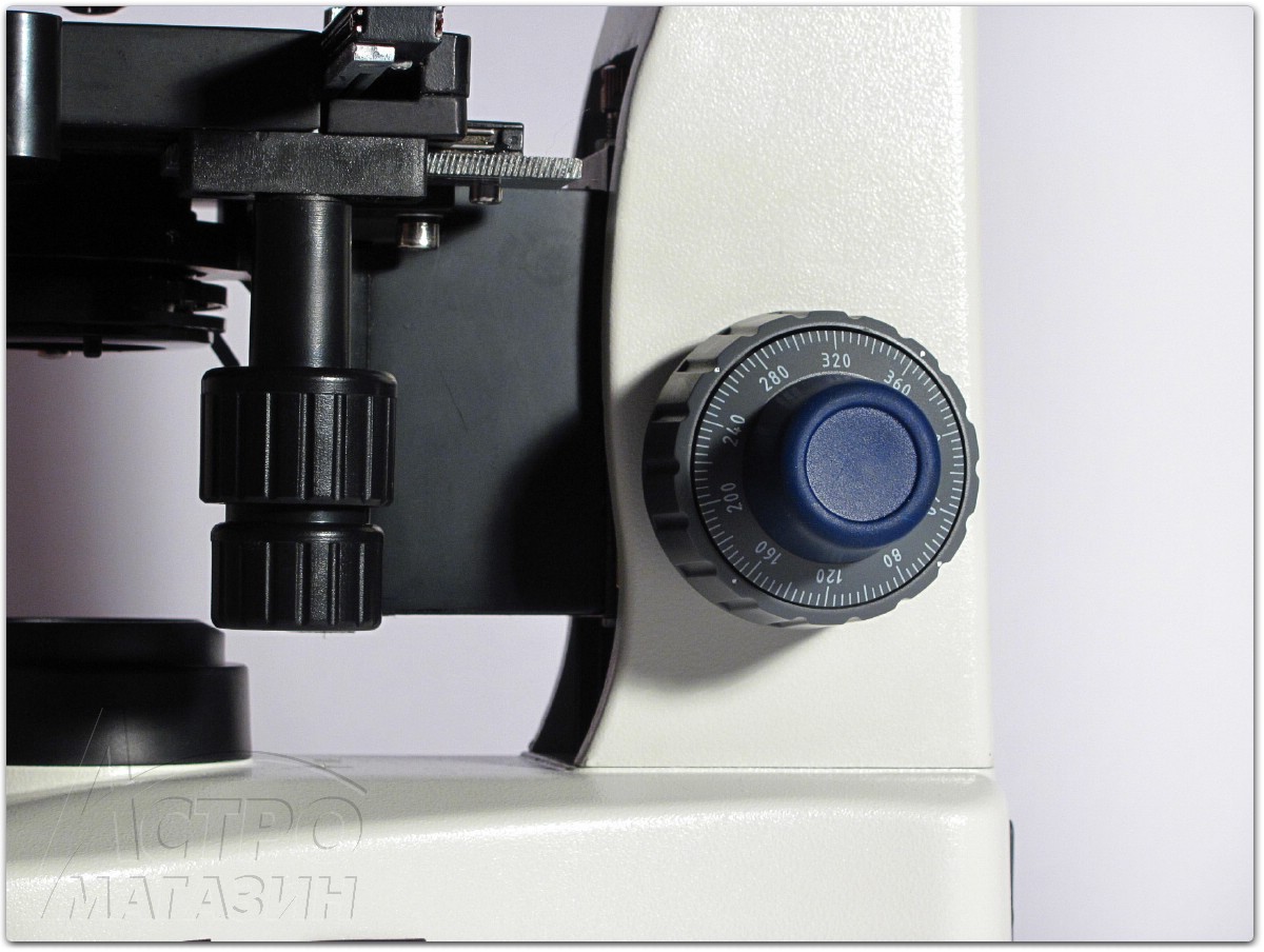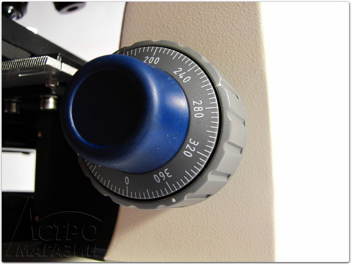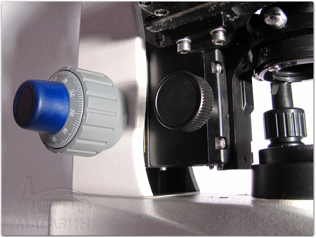 Самый интересный механизм микроскопа – это, конечно, блок суппортов предметного столика, или координатный нониус. Ручки регулировки вынесены справа от столика и находятся на одной оси, что удобно в работе.