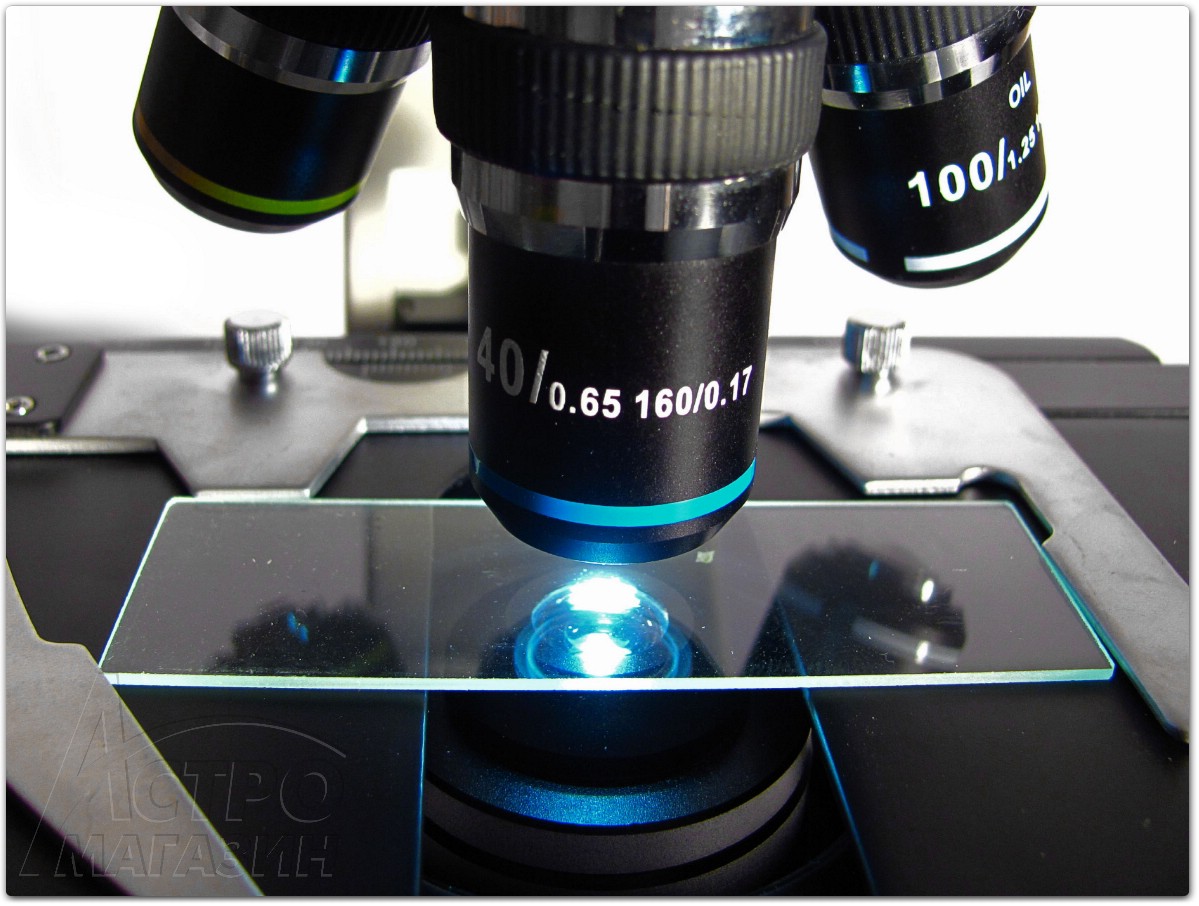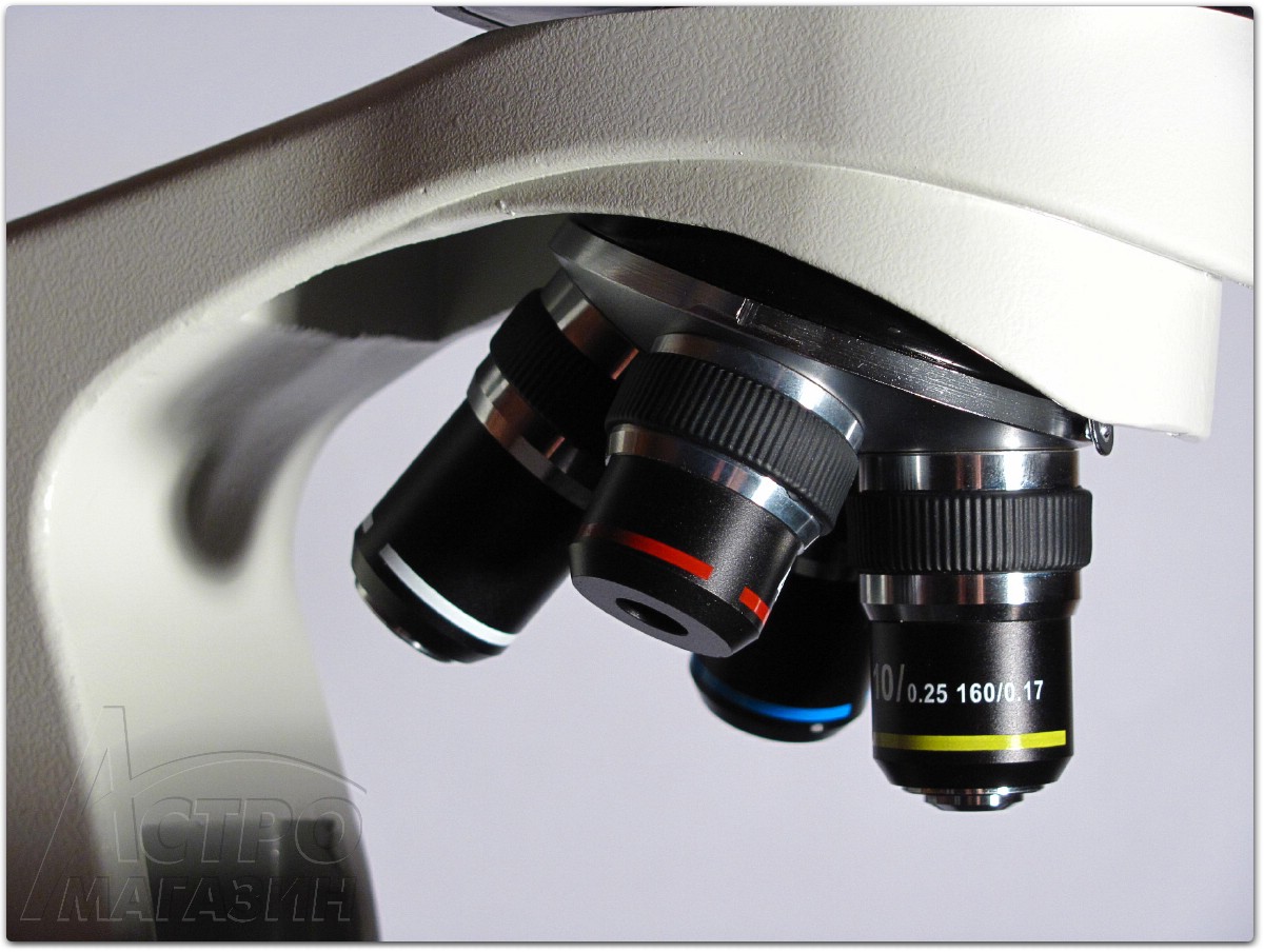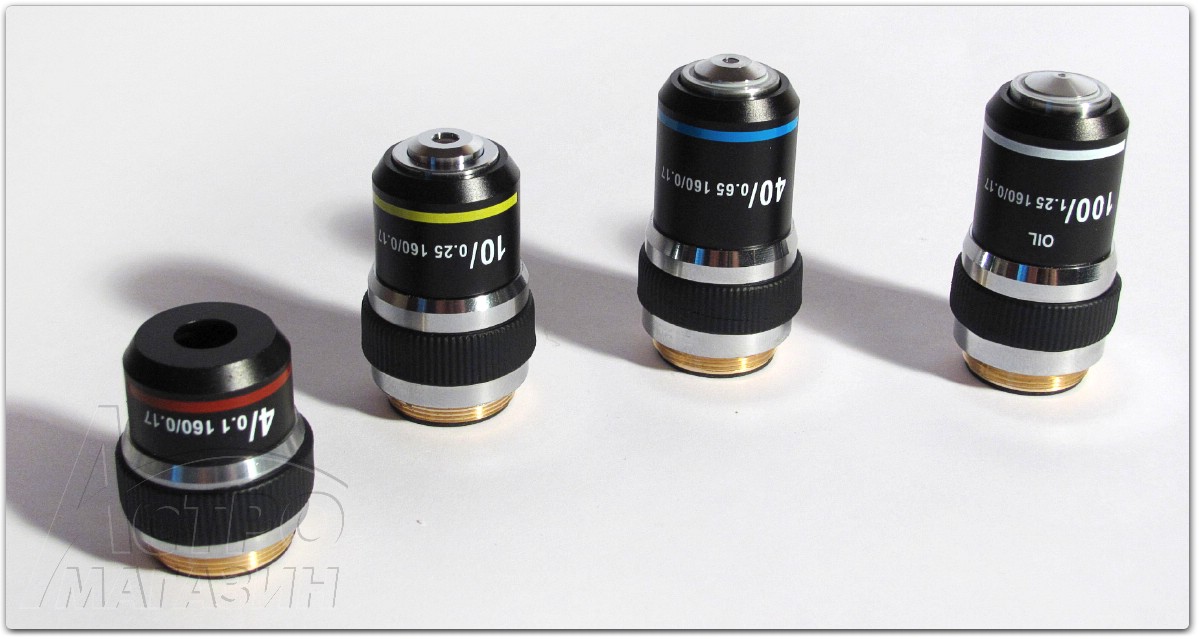 Три ахроматических просветлённых объектива 4х, 10х и 40х дают с комплектным 10х окуляром увеличение 40х, 100х и 400х, соответственно. 100х объектив иммерсионный и для того, чтобы получить чёткую картинку с увеличением 1000х, на покровное стекло препарата необходимо капнуть иммерсионное масло и погрузить в него объектив.