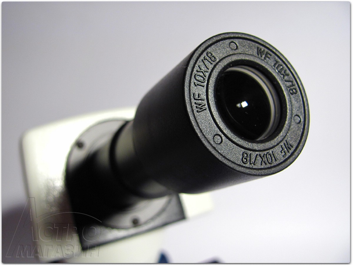Призменная головка крепится к верхней части станины и может вращаться на 360 градусов, так что удобное положение для наблюдений найти будет несложно. Окуляр в комплекте один, он также хорошо просветлён и с ним микроскоп максимально даст 1000х. Если этого будет недостаточно можно докупить дополнительно 16х окуляр, который выпускается для серии Genetic Pro, и даёт со 100х объективом увеличение 1600х.